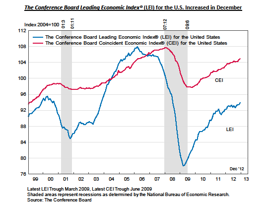 (+) The Conference Board’s indexes of economic indicators were released for December, with less fanfare these days it seems. The leading economic index rose 0.5% to 93.9, which was an improvement on an unchanged reading from the month prior. Results were led by better numbers in employment claims, building permits and credit (two-thirds of all indicators were positive), while consumer expectations and manufacturing new orders remained weak. The coincident and lagging indicators also rose over the month. The leading index certainly picked up speed over the second half of 2012 compared to a slower increase during the first half. The longer-term trendline has moved in an upward trajectory since the financial crisis—as seen in the chart below.