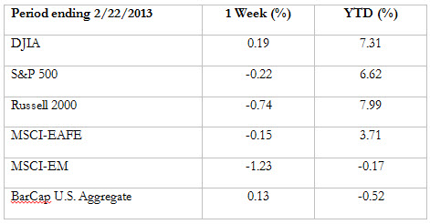 (-) The Philadelphia Fed index underperformed for February, which added fuel to the fire for Thursday’s market drop. The resulting -12.5 point drop stood in stark contrast to an expected improvement of +1; however, the underlying components were not quite as bad as the index looked, with assessments of the general business climate coming in as worse than the orders, capital spending, shipments and employment metrics themselves. Additionally, there were some optimistic anecdotes for early 2013…