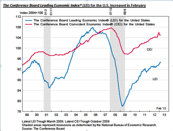 The Conference Board’s index of Leading Economic Indicators rose +0.5% in February to 94.8, matching the level of January’s increase. While consumer expectations and new manufacturing orders were a bit weak on the month, financial components (including stock market results and interest rate spreads), building permits and manufacturing workweek were all positive. By contrast, the coincident indicator rose +0.2%, led by production and payrolls and reversing January’s decline, and lagging indicator rose +0.1%. The trend of these indicators combined (which is the power of this measure), continues upward.