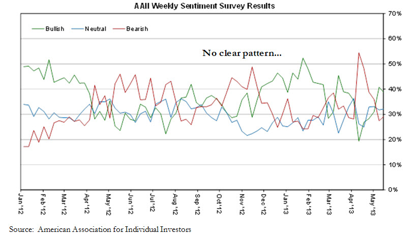 (+) Speaking of sentiment, investor sentiment as measured by the American Association of Individual Investors comes out each week and offers an interesting glimpse into retail investor behavior. Since the late 1980’s, investors have felt ‘bullish’ about 39% of the time, while the ‘neutral’ and ‘bearish’ respondents have been numbered just above 30% each on average. However, these measures change weekly and can hit various extremes, as you might expect. The bullish and bearish respondents have each hit a maximum of 70-75% and minimum of 6-12% over the last few decades (naturally, the late 1999-2001 tech bubble period was overwhelmingly bullish, while the following bust years as well as 2008-early 2009 were quite bearish). The measure is quite fickle and past performance-related. One thing we have noticed is that sentiment in the most recent rally has not truly solidified in a comprehensive or consistent way. It continues to be very sporadic, and investors continue to appear skittish—which is also consistent with anecdotal reports of general public sentiment of investment markets post-2008. This lack of excitement has proven to be a contrarian bullish signal of sorts.