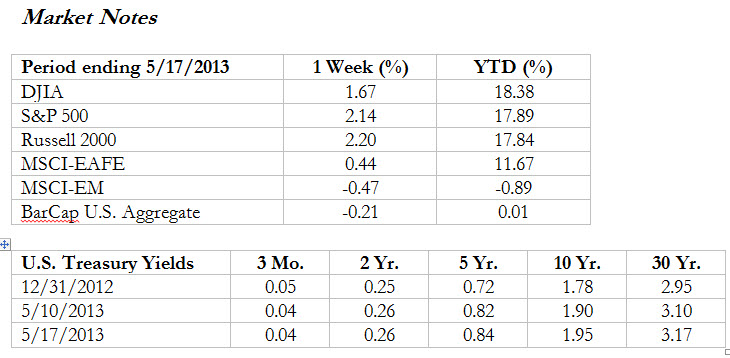 (+) The preliminary May reading for the University of Michigan Consumer sentiment survey showed a greater-than-expected rise from 76.4 to 83.7, which outperformed the consensus estimate of 77.9, and hit a new six-year high. In contrast to other anecdotal information from other areas, consumer assessments of current conditions rose dramatically, as did their expectations for the future (although commentary indicated that this sentiment increase was most apparent in the top 1/3 of households, ranked by income). Inflation expectations for the forward-looking year remained stable at 3.1%, while the 5-10 look-ahead figures dropped a bit to 2.8%—although remain on par with long-term averages.