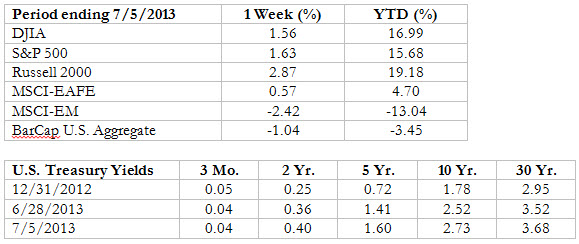(+) On an otherwise quiet Friday, the employment situation report came in better than expected. The unemployment rate was unchanged at 7.6% (despite forecasts for this to drop 0.1% to 7.5%), but the labor force participation rate improved—which was taken as a positive development, even if it was by only a tenth of a percentage point. Nonfarm payrolls grew by +195k in June compared to the median forecast of +165k, and a total of +70k jobs were added to the prior month reports. For June, the largest job gains were in leisure/hospitality of +75k, professional/business services of +53k and retail trade of +37k, while manufacturing lost -6k. Aside from planned ongoing attrition from the U.S. Postal Service, Federal government job losses were minor (which surprised some fearing the worst from sequester effects). Peripheral data, such as average hourly earnings rose +0.4% (+2.2% year-over-year), compared to the expected +0.2%, while average hours worked were unchanged at 34.5. The aggregate weekly payrolls (which combine employment, hours worked per worker and per hour earnings) ticked up +0.6%—the important part about this being the correlation to wage growth as an inflation input. This appear contained and in line with other data.
