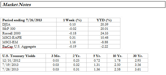 (+) The final University of Michigan consumer sentiment survey results were revised up positively, from the initial estimate of 83.9 to 85.1 for July (forecast being 84.0)—to a new high for sentiment in the post-recession period. For the month, consumer expectations about the future rose a bit, while assessments of current conditions fell by a small amount. Inflation expectations fell slightly (one to two tenths of a percent) for the short- and long-term periods, hovering just below 3%. Consumer sentiment is certainly continuing to improve, although it is fickle and news-based. From a broader perspective, higher readings here ultimately translate to better buying patterns and economic bullishness—both of which have been difficult hurdles in recent years due to job concerns and investment market volatility all too fresh in many minds.