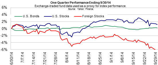 Last quarter, we talked about the ‘efficient frontier’ and the beneficial effect over time of combining asset classes within your portfolio that don’t move in lock-step with each other. Looking at the world’s stock markets over this last quarter has given us a ready example of different markets moving differently. While large US stocks finished the quarter in positive territory, international equities had a tougher go of it, buffeted by concerns about Ukraine, Africa and slowing economic growth in both Asia and Europe.