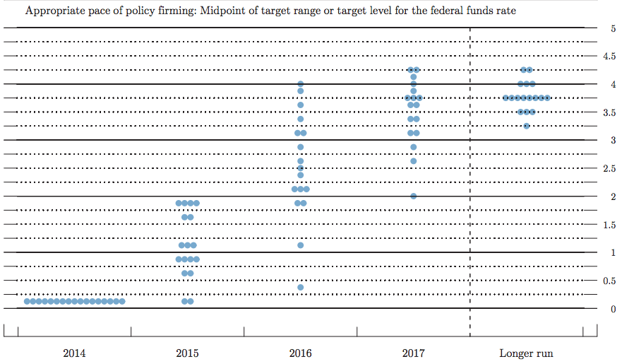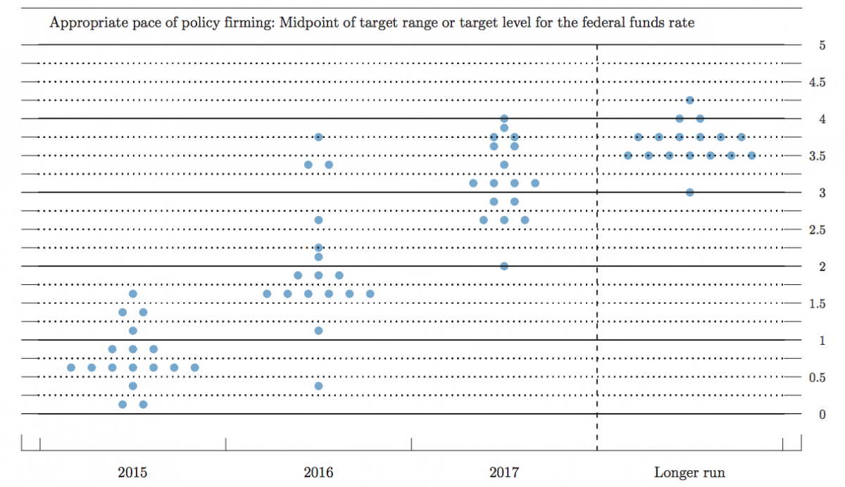 This week’s charts are Dot Plots, a visual depiction of the expectations FOMC meeting participants hold of where the federal funds rate should be in different points in the future. The dropping of the term ‘patient’ received most of the publicity in release of the FOMC Meeting minutes yesterday, giving the false sense of a hawkish theme. The actual statements from the Fed conflictingly painted a dovish tone. There were clear concerns with the rising dollar causing headwinds for growth, and the Fed downgraded their expected economic output from 2.6-3.0 percent to 2.3-2.7 percent accordingly. Incidentally, participants of the meeting lowered their expectations of where the federal funds rate should be by the end of 2015. The median expectation dot is at 0.625 percent, down from 1.125 percent in the December statement, suggesting that rate rises are more likely to be announced later (in the September meeting) rather than sooner (June meeting).