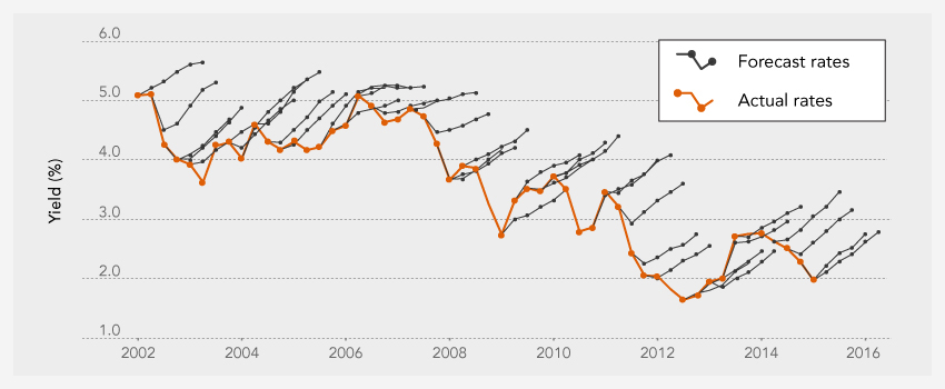 This week’s chart shows just how difficult it is to predict rate changes. The black lines represent five quarters of median forecasts of the yield on the 10-year U.S. Treasury. The orange line represents the actual realized yield during that particular point in time. These forecasted predictions come from the Survey of Professional Forecasters (SPF), as measured by the Federal Reserve Bank of Philadelphia. It is easy to see that forecasters have been too bearish on bonds for the past 10+ years, consistently overestimating future increases in rates.