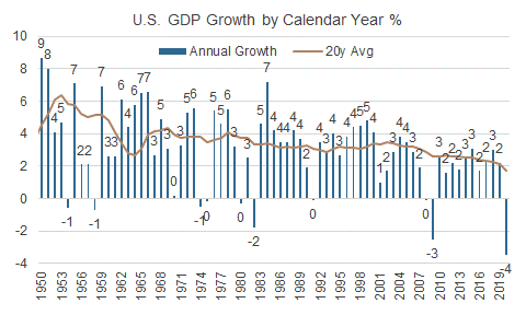 After the trough and quick recovery, though, the consensus view from many economists seems to be that we’ll eventually revert back to the 2.0-2.5%-ish growth range of the past decade. Shorter-term disruptions aside, long-term growth is driven by such things as demographics, labor force size, and productivity. As seen by the chart below, overall U.S. GDP growth has been on a steady downward trend in keeping with these factors.