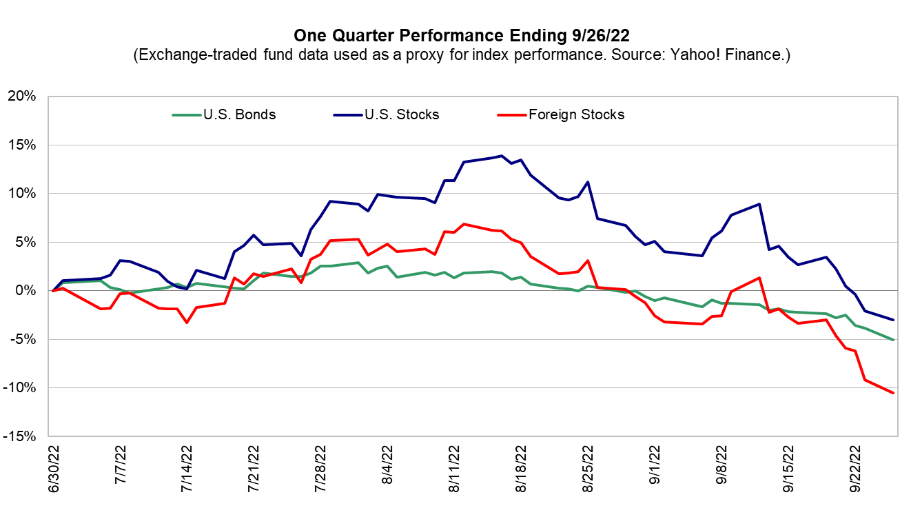 Well, gosh, here we are again. This last quarter started on a somewhat positive note with stocks rising until the middle of August. That cheer didn’t last however as uncertainties about rising interest rates and the direction of the economy pushed us back to a bit lower than where we started. Bonds followed a similar pattern as folks wrestled with the idea that interest rates would climb higher than had been anticipated earlier this year.